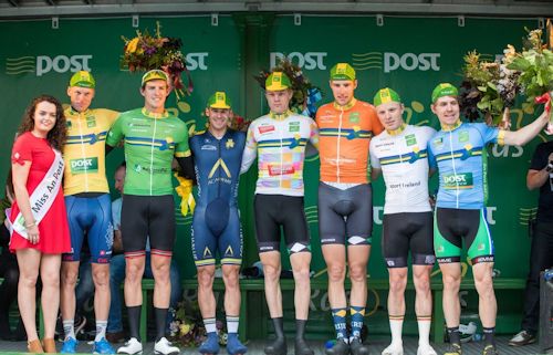 Nicolai Nielsen, Denmark Riwal Platform Cycling Race Leader ,Christopher Lathan, Britain Team Wiggins Green, Matteo Cigala Cork Aqua Blue Sport 1st County Rider,Dennis Bakker, Netherlands Team Mountains Leader,Jan-Willem Van Schip,Delta Cycling Stage Winner,Sasha Weemaes Belgium National Team Sports Ireland White Jersey, Chris McGlinchey, Cycling Ulster Leading County Rider Overall |