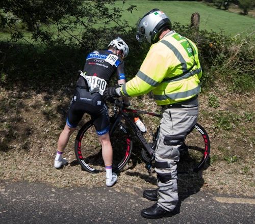 No 190 Ronan O'Shea Wateford is helped back on his bike by one of the officials |