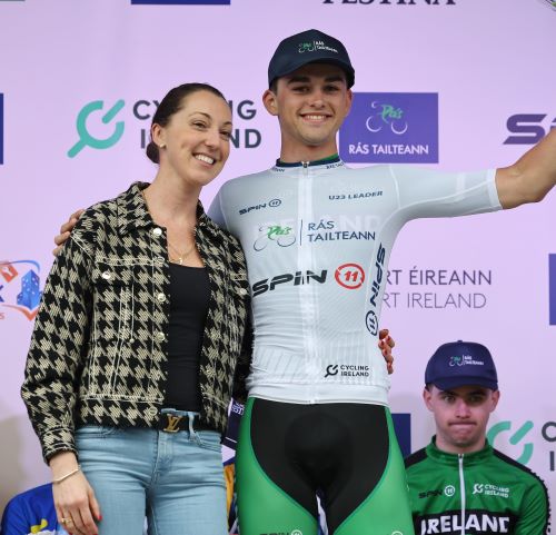 Maria Connaughton of Spin 11 presents Aaron Wade (Team Ireland) with the Spin 11 U23 Rider Jersey after stage 2 of the 2023 Rás Tailteann |