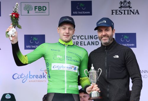 Johnny Drake (Managing Director) of City Break Apartments presents Tim Shoreman (Wheelbase – Cabtech – Castelli) with the points jersey in Bective during Rás Tailteann 2024. (Picture Lorraine O'Sullivan) |