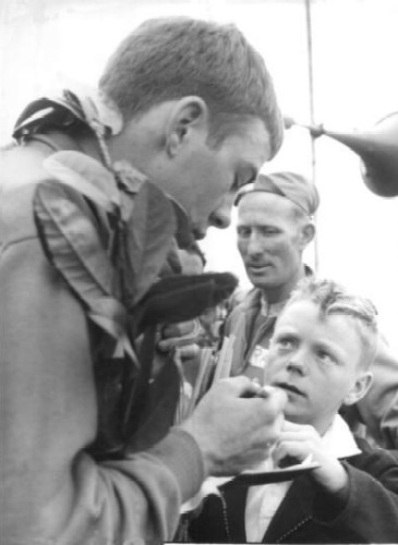 Shay With The Victory Laurls Around His Shoulders Signs Autographs For A Young Admirer |