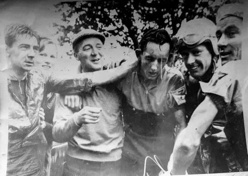 Gabriel Howard after winning stage two of the 1965 Ras Tailteann from Monaghan to Birr 115 Miles in 5-35-00. Gabriel shattered after his win is helped off his bike by his friend Leo Collins and his Wife Celine in background with Mick Collins on left |