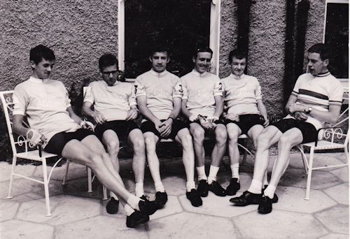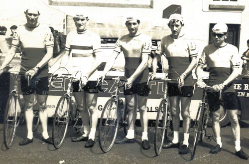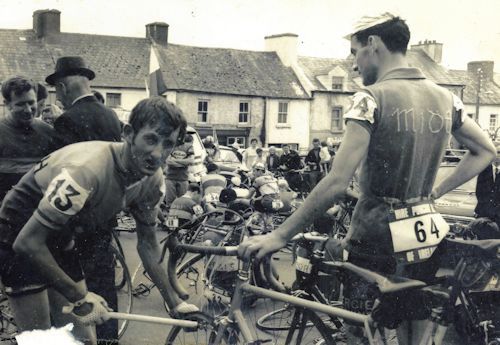 Mossie Donoghue, Cork, Denis McGrath in Louth colours RHS, Mick Collins next to Denis McGrath and Colm Nulty in Meath colours LHS 2 Navan RC riders Larry Clarke on foot and Mick Creighton Middle, at the start of stage 3 in Ballyjamesduff. |