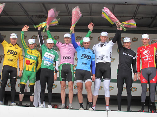 Ian Wilkinson Yellow ,Paul Griffin Kerry Rider, Russell Downing Green,David McCann Pink,Jaan Kirsipuu Stage Winner,Ole Jorgen Jensen White ,Chris Newton 2nd. Brian Kenneally County Rider |