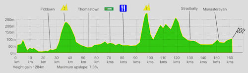A mass gallop is possible on the penultimate day of racing on Saturday May 27th . This covers 157 kilometres from Tramore to Kildare and while it is mainly flat, it does include the category two slopes of Brown Mountain (km 34.2) and the category one climb of Clogrennane (km. 98.8). The racing will also be shaken up by Post Office Primes at Gowran (km. 70.2) and a memorial prime for Rás great Paddy Flanagan in Kildangan (km. 145.7).