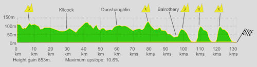 Kildare, Miltown,Hill Of Allen Category 3 KOM, Kilmeague, Prosperous, Painstown, Kilcock, Dunsany, Dunshaughlin, Ratoath, Curragha, Puckhimin Category 3 KOM, Garristown, Naul, Balrothery, Cross Of The Cage Category 3 KOM, Skerries, Black Hills Category 3 KOM, Skerries, Black Hills Category 3 KOM,Sherries.