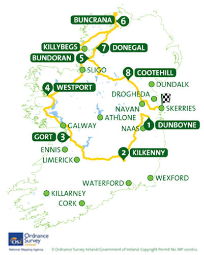 Passing through a total of fourteen counties and totalling 1168 kilometres over the eight days, the race will again get underway in Dunboyne, Co. Meath (home club of O’Sullivan) on Sunday May 20th. It follows a roughly clockwise direction, heading north west this year, instead of south west, with stage finishes in Kilkenny, Gort, Westport, Bundoran, Buncrana, Killybegs, Cootehill and Skerries.