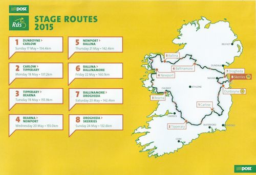 The 2015 edition of the race will begin in Dunboyne, travelling clockwise around Ireland with stage finishes in Carlow, Tipperary, Bearna, Newport, Ballina, Ballinamore and Drogheda, before the customary finale in Skerries.